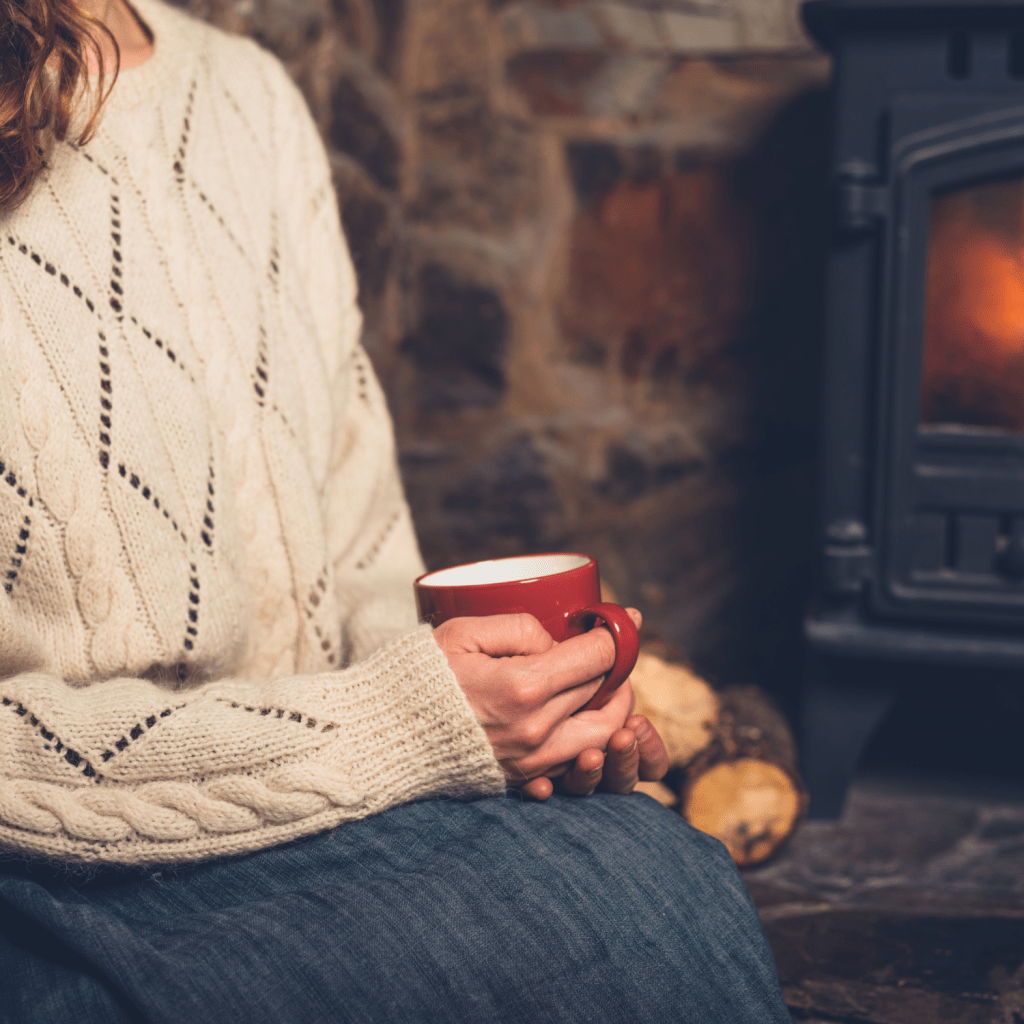 - Enjoying a cup of tea by the fireplace